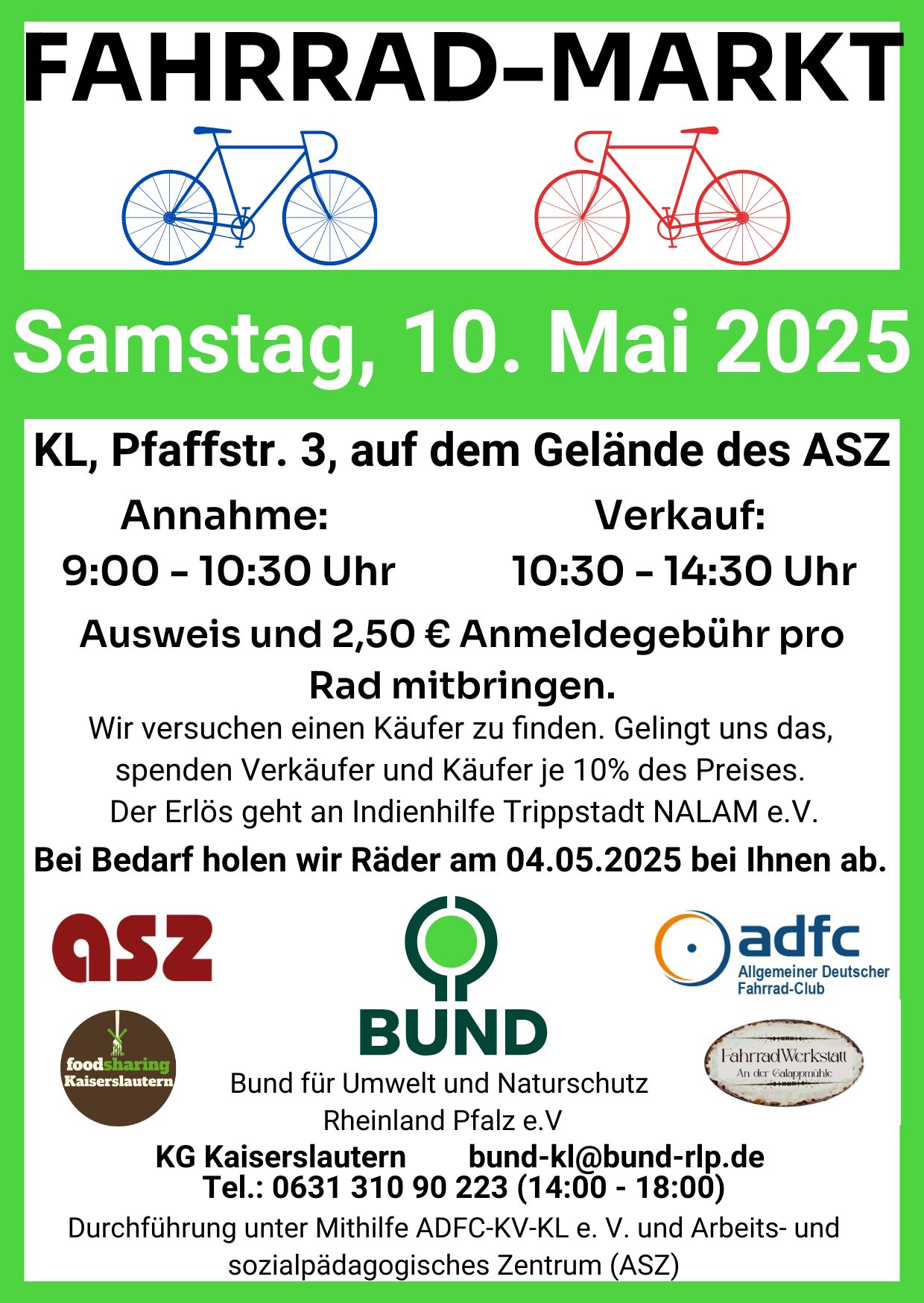 Der BUND bittet die Verkäufer darum, einen Ausweis mitzubringen. Zudem wird eine Verkaufsgebühr von 2,50 € pro Rad erhoben. Das BUND Team bietet zudem an, Fahrräder abzuholen, wenn es jemandem nicht möglich sein sollte, sie selbst zum Markt zu transportieren. Der Abholtermin ist am Sonntag, den 4.5.2025 (Anmeldung unter BUND Kaiserslautern Tel. 0631 31090223 von Montag bis Freitag zwischen 14 und 18 Uhr oder gosia.schulze@bund-rlp.de).