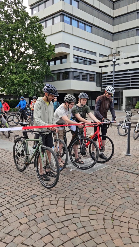 Vom Rathaus aus ging es traditionell direkt auf verschiedene Touren, je nach Gusto, Bike und Leistungsvermögen standen eine Rennradtour, eine Mountainbiketour und auch zwei mehr oder weniger gemütliche Feierabendtouren zur Wahl. Mit dabei waren auch die zwei diesjährigen „Stadtradeln-Stars“. Chris und Richard Fieker, 16 und 20 Jahre alt, haben sich entschlossen, drei Wochen lang aufs Auto – auch auf die Beifahrerrolle! – zu verzichten. Die beiden Brüder werden von ihren Erfahrungen in einem Blog berichten.